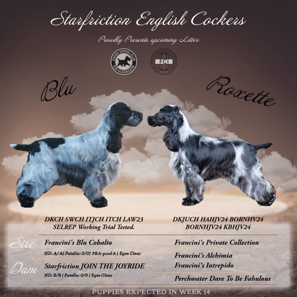 Planned Litter Winter 2026 13.01.2026 – Roxette is mated to Blu. If all ok, puppies will be expected in week 14. Puppy Photos